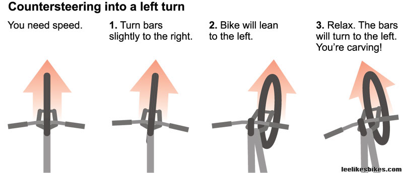 The concept is this, to steer a bicycle (actually anything on two wheels) through a corner, unlike a car where you turn the wheel to the left to make a left turn, you actually push the handlebar away on the left (turning the handlebar to the right “counter” to what you think), which changes the geometry of the bikes steering, causing it to lean into the corner in the direction of the push. Got that? To turn left you push the handlebar forward with your left hand, the bike leans left, and you go through the corner.
