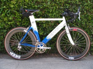In 2004 I decided to go all in and buy a real triathlon bike, made by another local company, Griffen, made of another ex-military developed material, Metal Matrix Composite, MMC. In reality it was just another kind of aluminum, that was stronger, lighter, and easier to shape into the complex airfoil shapes required by tri-bikes of the day. The frame and fork went for around $1800 I think, which was a deal because our local Santa Barbara Triathlon Club had an arrangement with the owner of Griffen to get us a nice discount. Once again I stripped the parts of my old bike, the McMahon, and built up the Griffen. This was an Ironman distance ready bike and I was hoping (at the time), to qualify for Ironman Hawaii with this bike as my ticket. I did get close a couple of times (within 1% on time, so close but yet so far!), but eventually I realized that I was just that little bit behind the real qualifiers when it came to the long run off the bike. Oh well, it was fun trying and I was still getting better.